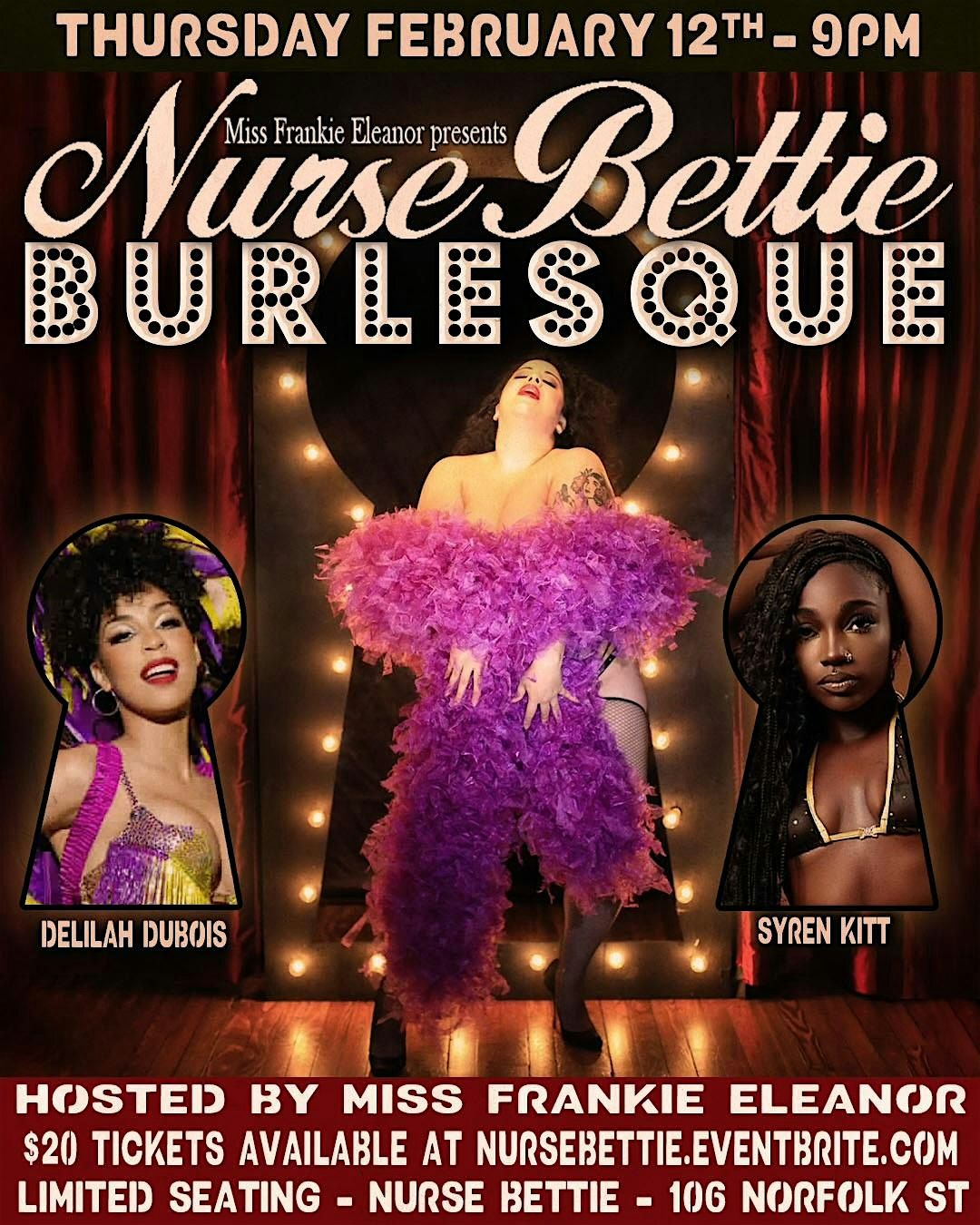 Miss Frankie Eleanor presents Nurse Bettie Burlesque! February 12th, 9PM. Featuring Delilah Dubois & Syren Kitt!About this Event