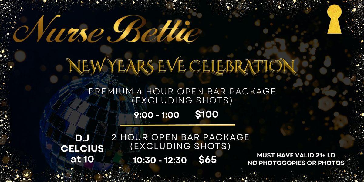 Nurse Bettie presents our 20th annual NEW YEAR'S EVE BASH - NYE 2026! NB is hosting an open bar with two available packages. 9pm to 1am and 10:30pm-12:30am featuring premium spirits, wine and beer! Party favors and a champagne toast at midnight are included. Come ring in the new year with your favorite NB bartenders, music by DJ Celcius starting at 9.