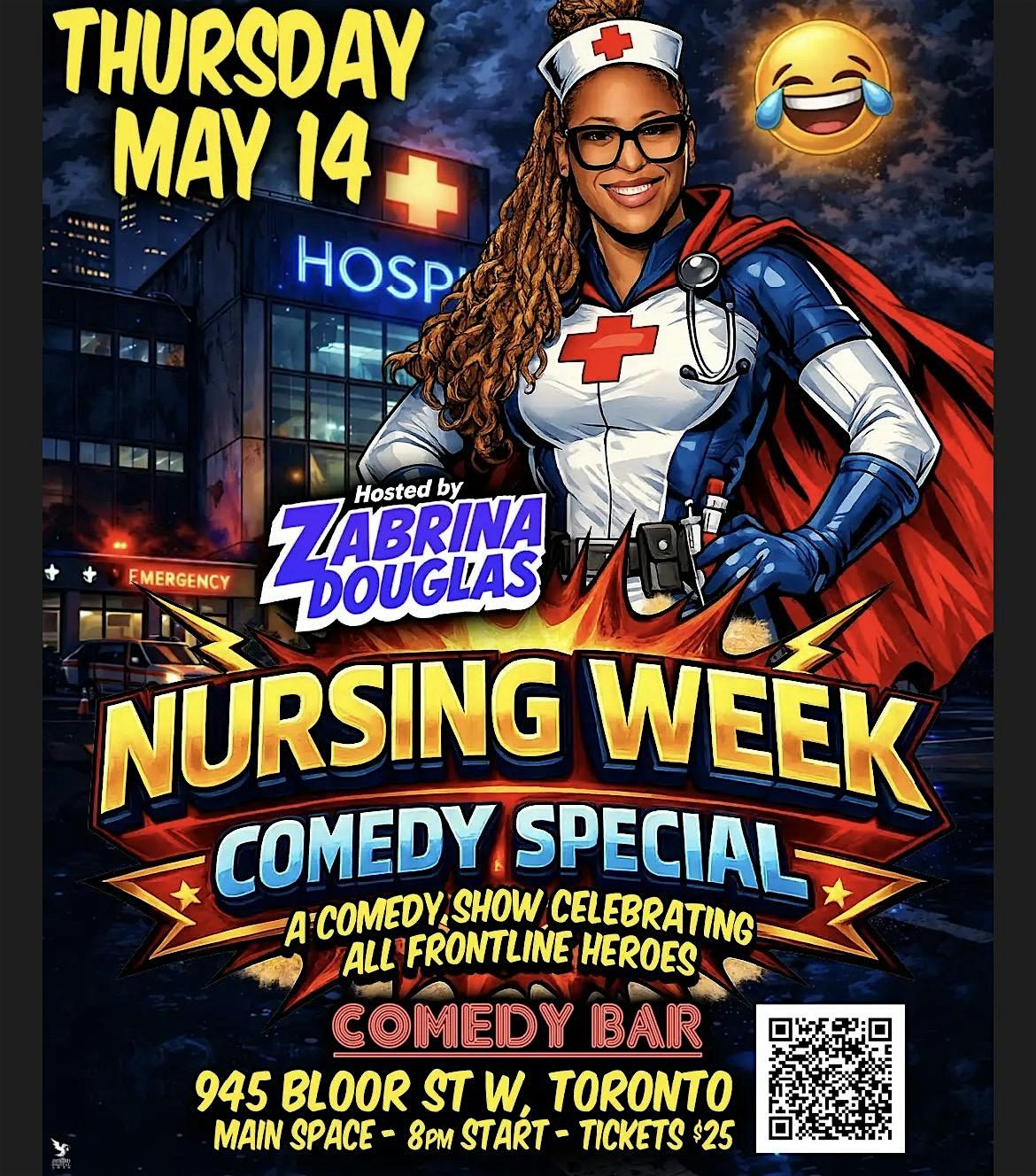 Toronto-based comedian and nurse Zabrina Douglas is proud to announce the lineup for her Nursing Week Comedy Special on May 14 at Comedy Bar Bloor in honour of National Nursing Week May 11-17, 2026. The Nursing Week Comedy Special celebrating frontline heroes includes Leny Corrado, Ernie Vincente, Danish Anwar, and Hisham Kelati. These talented comedians will use their talents to turn tough times into tears of joy for healthcare workers.