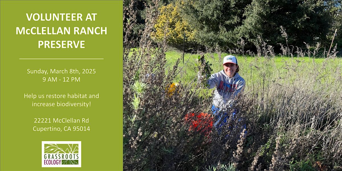 Join Grassroots Ecology in our ongoing restoration of habitat in the meadow at McClellan Ranch Preserve in Cupertino! We will spend our time together weeding invasive plants. Volunteers should expect to walk off trail on uneven ground, kneel or sit on kneeling pads, use hand tools and body tools, and carry buckets.