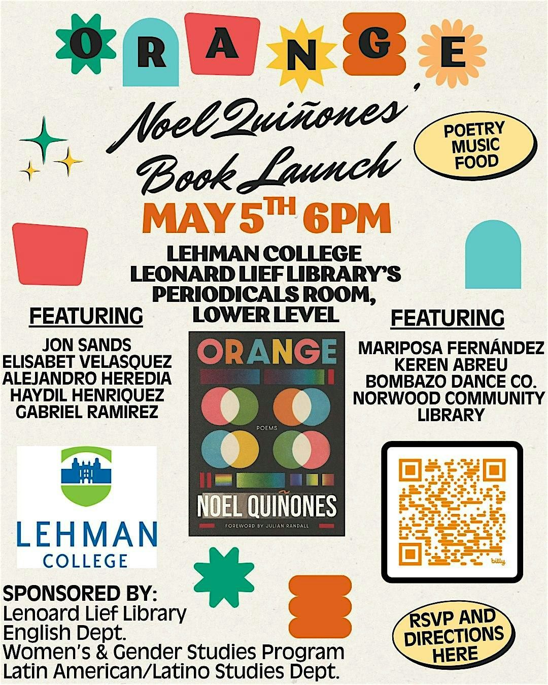 Through narrative poems and innovative forms inspired by color theory and elementary school, Orange explores the ripple effects of queerness, lies, and finding yourself in a family. In this visceral new collection, however, the scope of "family" expands well beyond the nuclear unit; Noel Quiñones's poems center relationships between friends, cousins, partners, and many other family members. Painting a vivid and fraught portrait of the North Bronx, Quiñones unflinchingly confronts the contradictions at the heart of love, divorce, gender, religion, and community, unpacking the complexities of coming out, divorced parents, and generational trauma. Orange ultimately argues that truth resembles color: something real, yet elusive, and impossible to prove. here or get a copy at the event.