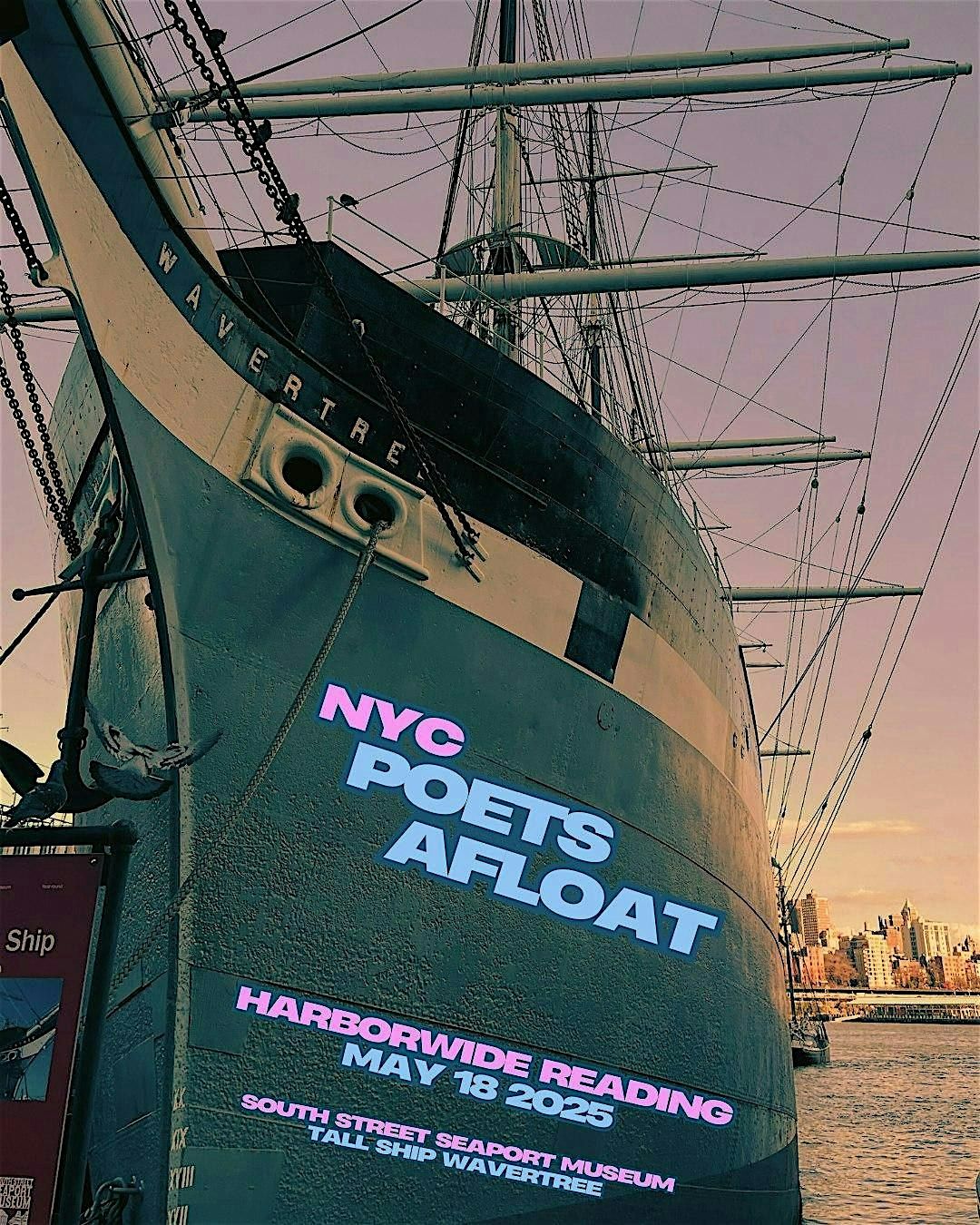 NYC Poets Afloat enters its seventh season! Each year, poets are stationed aboard ships around NY Harbor to write poetry on the water during National Poetry Month. Then, in May, they converge aboard tall ship Wavertree at the South Street Seaport Museum to share all that poetry. Come join in and listen along!