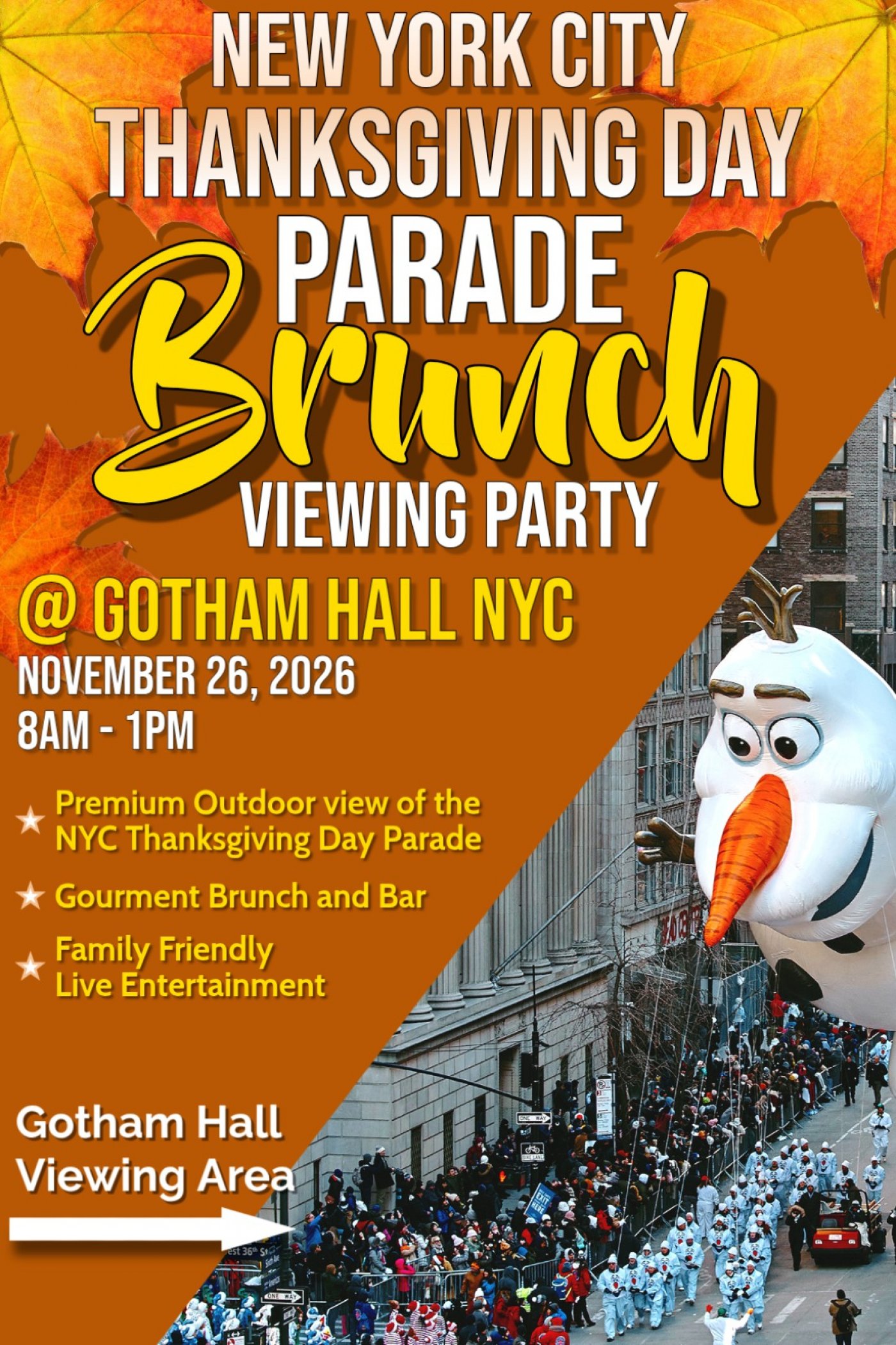 This all-inclusive event that includes a gourmet brunch, open bar, live entertainment, and access to outdoor viewing of the NYC Thanksgiving Day Parade. The event is held at Gotham Hall, a historic event space in Midtown Manhattan. The event is perfect for families, friends, and groups of all sizes.