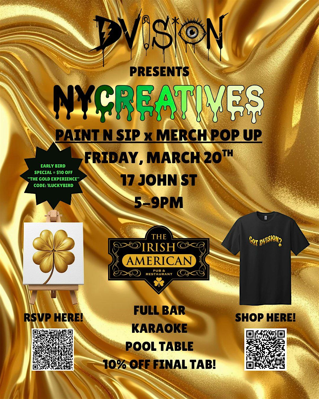 For one night only, Dvision is bringing a one of a kind pop up to The Irish American Pub. NYCreatives - “The Gold Experience”!