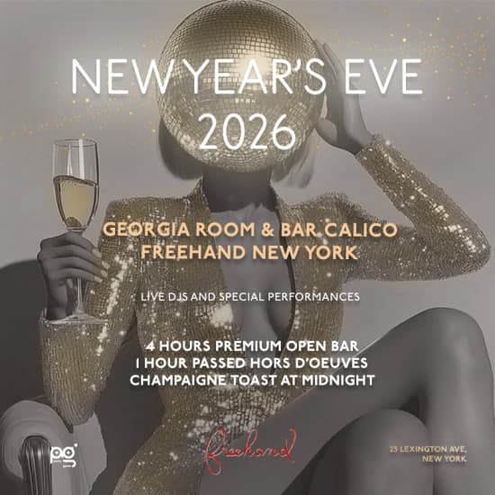 ๐ Gift this experience to your loved ones! Click here to check out our gift card. โญ Celebrate NYE 2026 at Georgia Room & Bar Calico in New York, NY! Get your tickets now for the most unforgettable New Year's Eve celebration! Highlights ๐ธ Enjoy a 4-hour premium open bar to kick off the new year in style. ๐ข Savor 1 hour of delicious passed hors d'oeuvres to start your night right. ๐๏ธ Access both the glamorous Georgia Room and the cool Bar Calico. ๐ง Dance all night with live DJs spinning the hottest tracks. ๐ฅ Join in for a midnight champagne toast to welcome 2026! General Info ๐ค Age requirement: 21+ with valid ID โฟ Accessibility: Yes ๐ Location / Venue: Georgia Room Nightclub & Bar Calico ๐ Dress code: Festive attire encouraged ๐ต Genre: Various, featuring live DJs Description This New Yearโs Eve, step inside the Freehand Hotel for a unique two-in-one celebration! Your ticket grants you access to both the extravagant Georgia Room, reminiscent of lavish historical balls, and the stylish Bar Calico, inspired by the artistry of Georgia OโKeeffe. Indulge in exquisite hors d'oeuvres, dance to electrifying DJ sets, and toast to new beginnings with champagne at midnight. Get ready for a night filled with fun, laughter, and memories that will last a lifetime. Donโt miss out on the ultimate NYE 2026 experience โ get your tickets now!