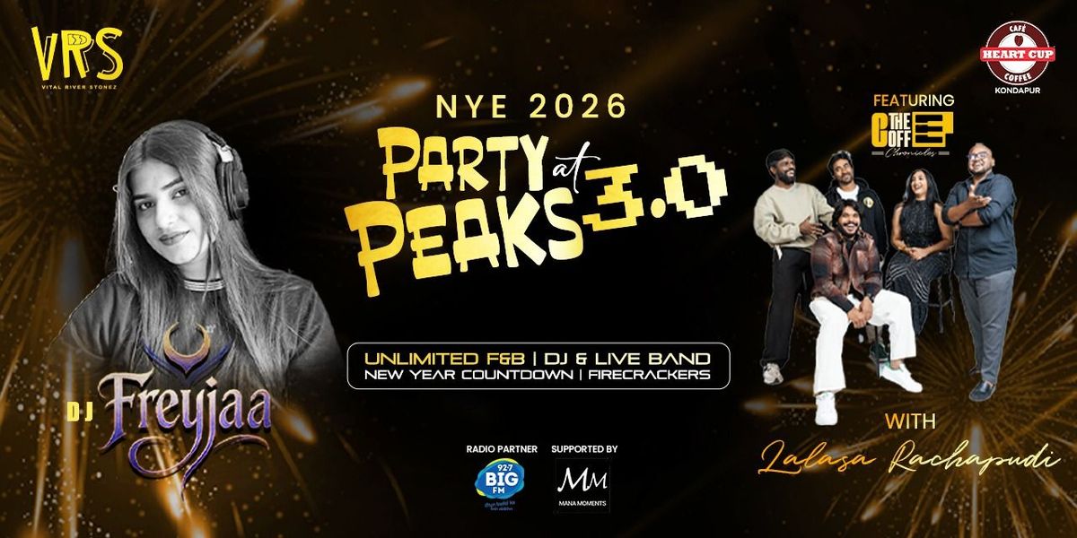 The Ultimate Countdown Awaits! Ring in 2026 with the most spectacular celebration in the city Party at Peaks 3.0 at Heart Cup Coffee, Kondapur organized by VRS Events. Prepare for a night of non-stop excitement. Enjoy Unlimited food & Liquor, dazzling light shows, and a midnight toast you won`t forget. Limited tickets and exclusive VIP packages are available now. Don`t risk missing out—secure your spot for the year`s biggest night!