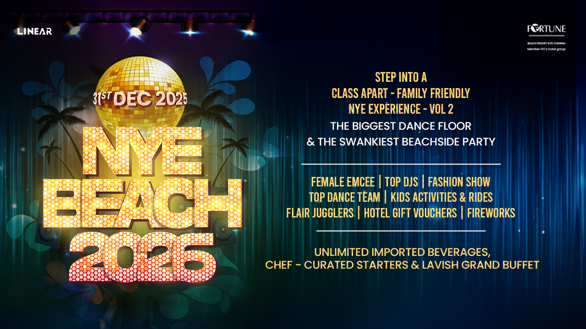 Step into a Class-apart, Family-friendly NYE Experience - Vol. 2 (Checkout Last Year NYE BEACH 2025 Snaps in Gallery)Experience the promise of a party by the beach, delivered the 5-star way, where the biggest dance floor meets the swankiest beachside celebration. After the massive success of NYE Beach 2025, we return bigger, bolder, and more exhilarating this year.Dance your way into the New Year on one of the largest beachside dance floors in the city.Enjoy unlimited premium imported beverages for adults, along with chef-curated starters and a lavish buffet spread. Thoughtfully designed for families, couples, kids, and groups to celebrate New Year's Eve in style.Hosted at a star-rated beachfront venue, just 5 minutes from Sholinganallur, the event is safe, professionally managed, and crafted for maximum comfort and enjoyment.Celebrate New Year's Eve the premium way At NYE BEACH 2026 - by the beach. ο»ΏDeck by the Beach(Beach Access) for Guests available all through the Event & post the NYE 12AM Countdown.We' ve got Kids Games, Classy Hosts & City's Top Nightclub DJs, Dance team, Variety Acts, Lucky Dip & Gift Vouchers, LED Wall Countdown & Fireworks.LUCKY DIP:π 2 Lucky Couples: FREE Weekend Stay at Fortune Beach Resortπ½οΈ 2 Lucky Couples: FREE Dinner Voucher at Fortune Beach Resortπ 1 Lucky Winner: Stay Voucher at a Choice of Fortune Leisure Stay Resort (Anywhere in India)Event Curated by Linear.IN a Property of Virtue IN. Agency