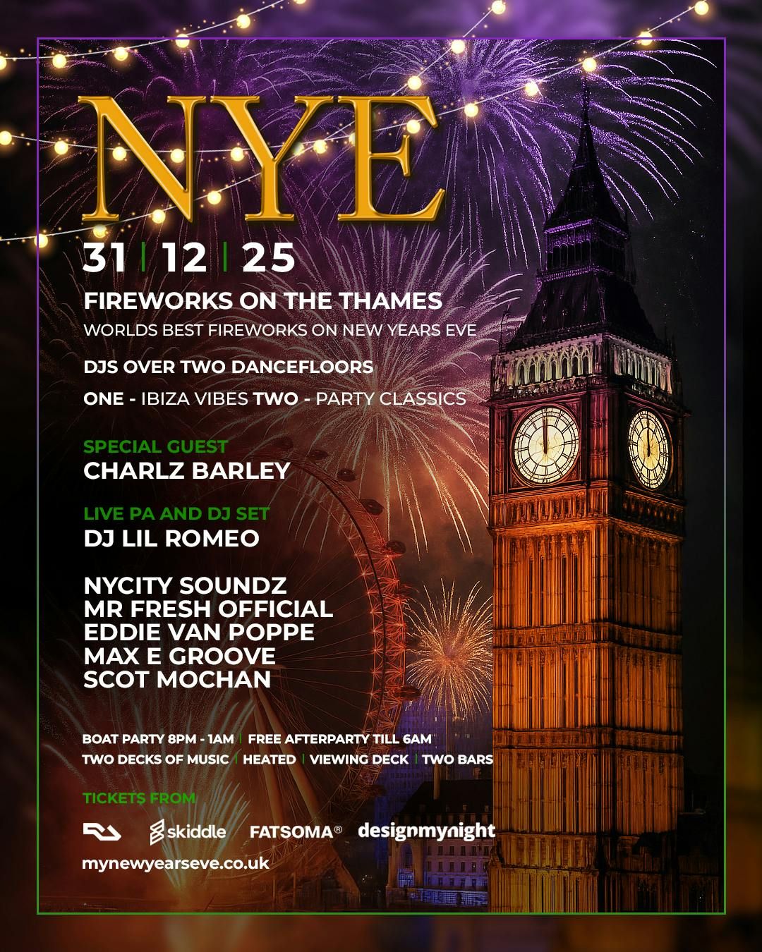 Step aboard for a night of non-stop celebration! Deck yourself out in your most dazzling, sequin-covered, tinsel-tastic outfit and get ready to party with two floors of London’s top DJs and performers. With drinks at pub prices and an incredible crowd of fun-loving revelers, you'll be dancing your way right up to midnight. Picture this: you're on the open deck, surrounded by the iconic London skyline, as Big Ben strikes twelve and the sky explodes with a breathtaking fireworks show just for you. This is the New Year's Eve you've always dreamed of!