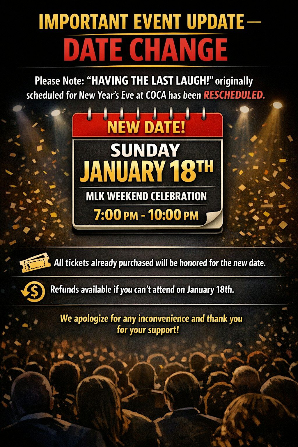 Please note that “HAVING THE LAST LAUGH!” originally scheduled for New Year’s Eve at COCA has been rescheduled.