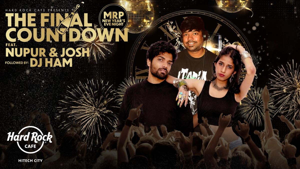 NYE: The Final Countdown ft. Nupur & Josh and DJ Ham (MRP Night)Get ready for a New Year’s Eve that hits every note just right as Hard Rock Café Hitech City brings you a power-packed celebration — NYE: The Final Countdown featuring the sensational Nupur & Josh followed by an explosive MRP Night with DJ Ham!Kick off the evening with Nupur & Josh, known for their magnetic chemistry, soulful vocals, and high-energy performances that blend indie favourites, pop hits, and crowd-loving classics. Their live set sets the perfect tone for a night that’s warm, vibrant, and full of feel-good moments.As the clock inches closer to midnight, DJ Ham turns up the heat with an MRP Night special — delivering a seamless mix of commercial hits, dance anthems, and party bangers designed to keep the dance floor packed till the very last second of 2025.With HRC Hitech City`s iconic atmosphere, premium menus, and a crowd that knows how to celebrate, this is the ultimate destination to welcome 2026 in style.Raise your glasses, feel the music, and join the final countdown — Hitech City is ringing in the New Year like never before! 🥂🎉💥