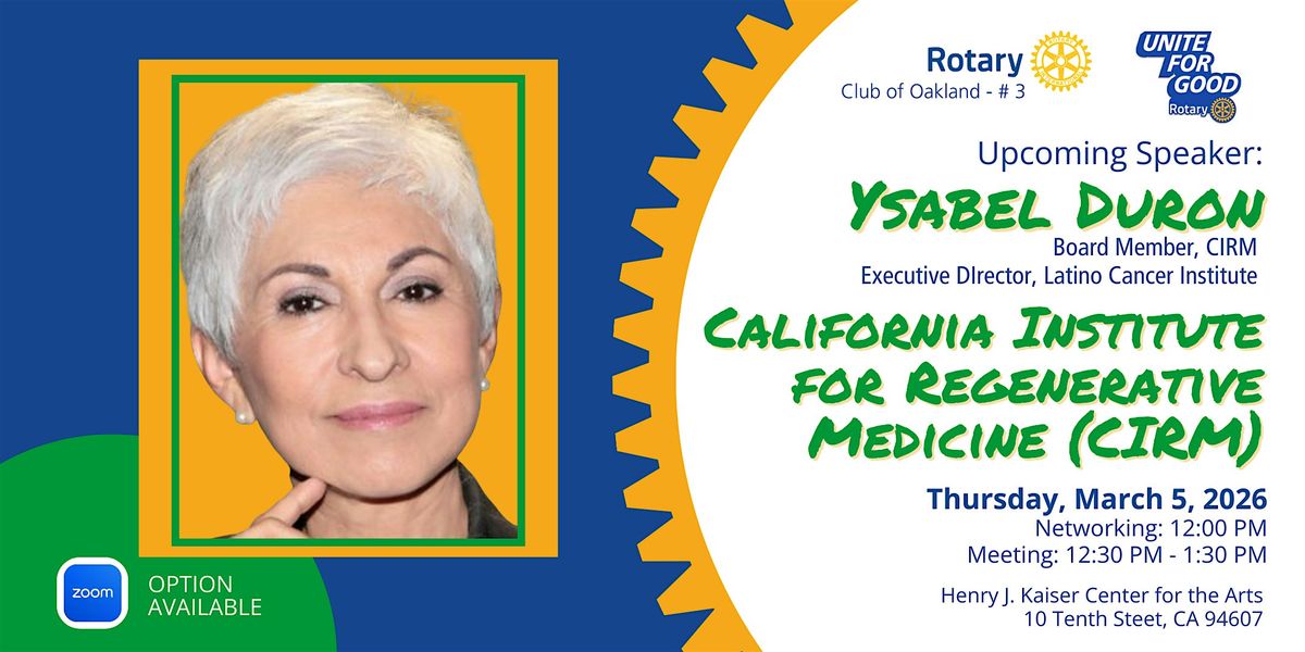 Join the Rotary Club of Oakland for a special luncheon featuring Ysabel Duron, Board Member of the California Institute for Regenerative Medicine (CIRM), Founder of the Latino Cancer Institute, and nationally recognized patient advocate.