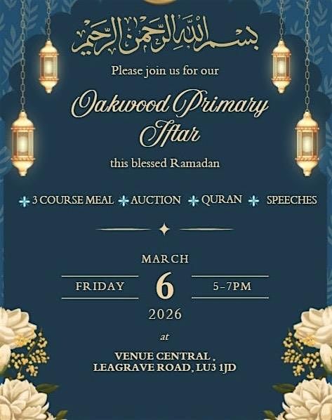 This is more than just an Iftar: it’s an opportunity to unite as a community, strengthen bonds, and invest in the future of Oakwood Primary School. Bring your family and friends and be part of an evening filled with barakah, generosity, and joy.