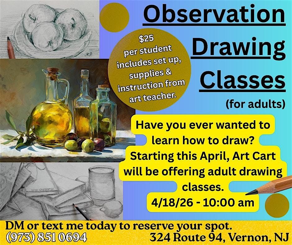 From still life sketches to paintings, learn the fundamentals of observation drawing. Join our new adult classes at Art Cart in Vernon, NJ. Supplies included! Text (973) 851-0694 to sign up.