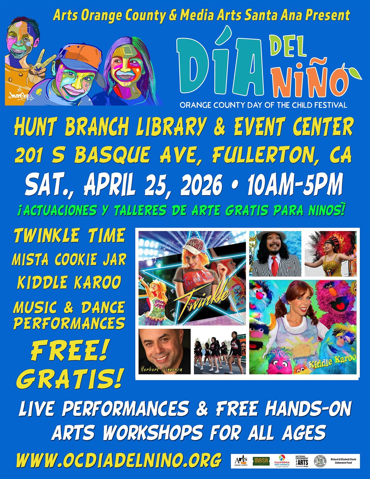 The Hunt Branch Library and Event Center is located at 201 S Basque Ave in Fullerton. The 2025 OC Día del Niño Festival is presented by Arts Orange County (ArtsOC) and Media Arts Santa Ana (MASA). For more information, visit www.ocdiadelnino.org.