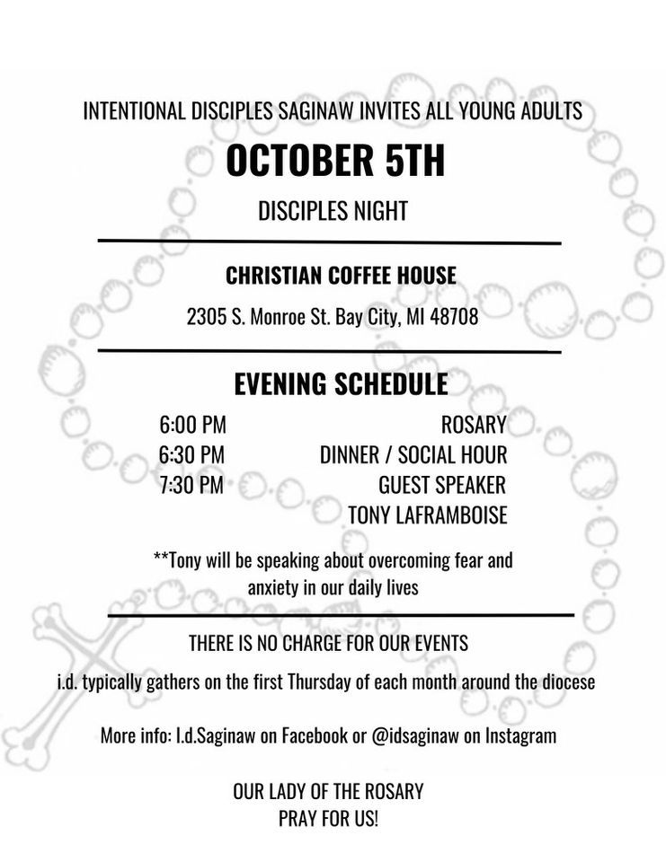 All young adults are invited to join us for our upcoming Disciples’ Night, Thursday October 5th at the Christian Coffee House in Bay City! With October being the month of the Holy Rosary, we will begin by praying the rosary at the Fatima Statue by St. Hyacinth church on Michigan Avenue!6:00pm - Communal Rosary at the Fatima Statue. Please bring outdoor chairs or blankets if you’d like! Rain or cold weather location will be in the Coffee House.