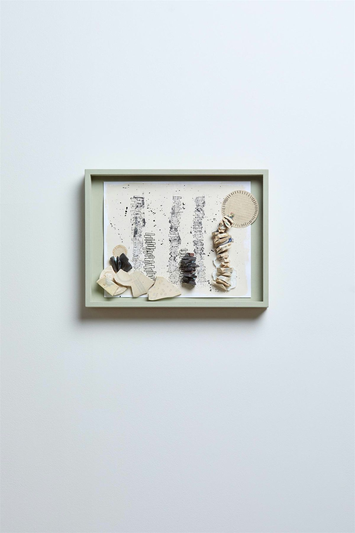 Using ceramic waste, metal, fused glass, and found objects, Harvey creates landscapes and forms that reflect on time and change. Etched with protective marks and drawings, these works carry traces of the past while offering space for new stories. They sit between object and idea, held within frames, stacked, or laid out like ruins - waiting to be read.