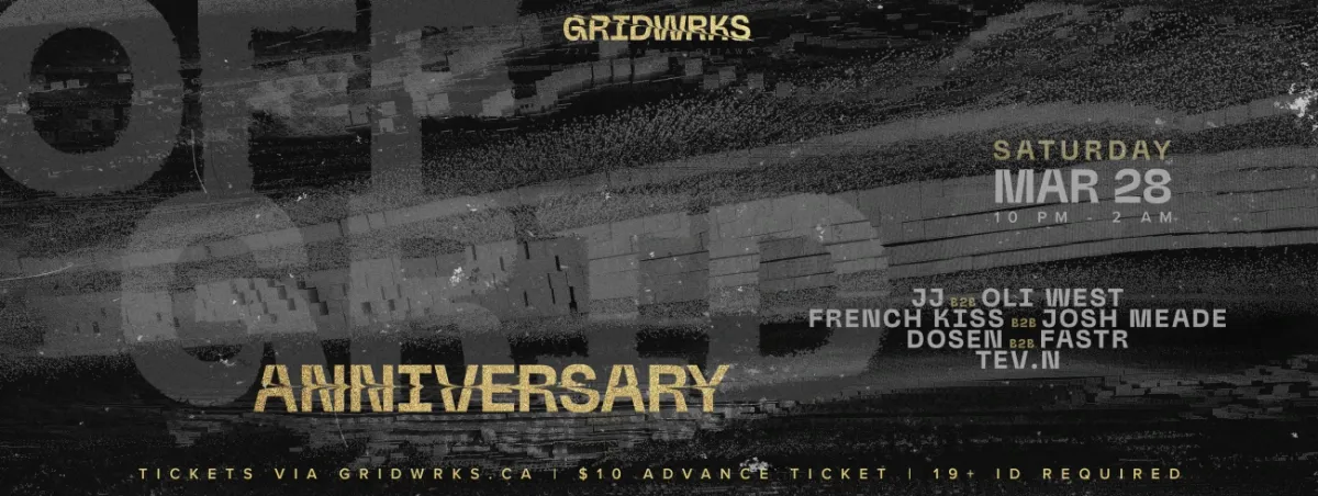 One year of GRIDWRKS, we're celebrating on March 27-28 weekend! Opening this space was a commitment to growing the City family and investing in the culture we believe in. Over the last twelve months, we’ve hosted new sounds, new collaborations, and new communities under one roof. It hasn’t been simple — growth never is — but the support from artists, promoters, and the dance floor has made it worthwhile. Thank you for backing the expansion and helping shape what GRIDWRKS has become.OFF GRID has become the heartbeat of Saturdays at GRIDWRKS — a weekly platform that has showcased hundreds of DJs over the past year, most of them local, all pushing deeper into the diverse world of electronic music.For our one-year celebration, we’re bringing together some of our favourite OFF GRID moments as special b2b sets:JJ b2b OLI WESTFRENCH KISS b2b JOSH MEADEDOSEN b2b FASTROpening set by TEV.NA night dedicated to the artists who shaped year one — and the dance floor that made it possible.10pm-2amCity Gridwrks221 Rideau St19+