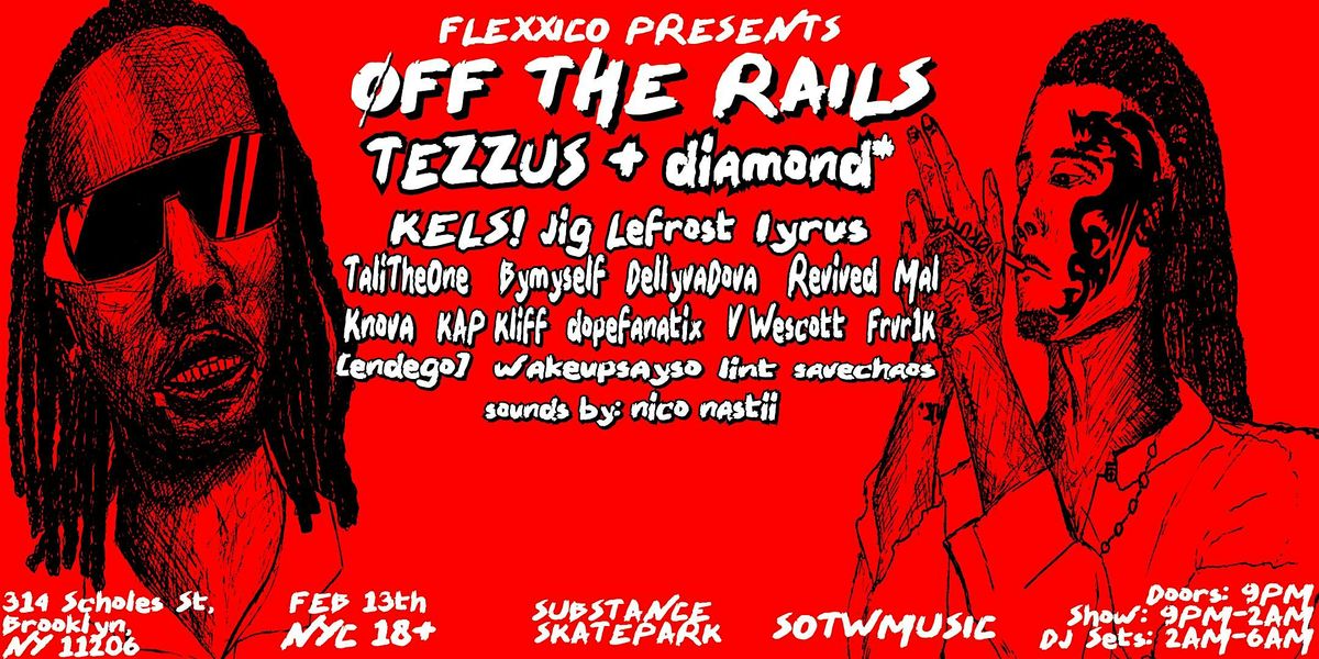 Tezzus & diamond* NYFW RIOT at Substance Skatepark. Support from kels! Iyrus Jig Lefrost & UG showcase. Doors at 9PM. Show 9PM-2AM.Agenda