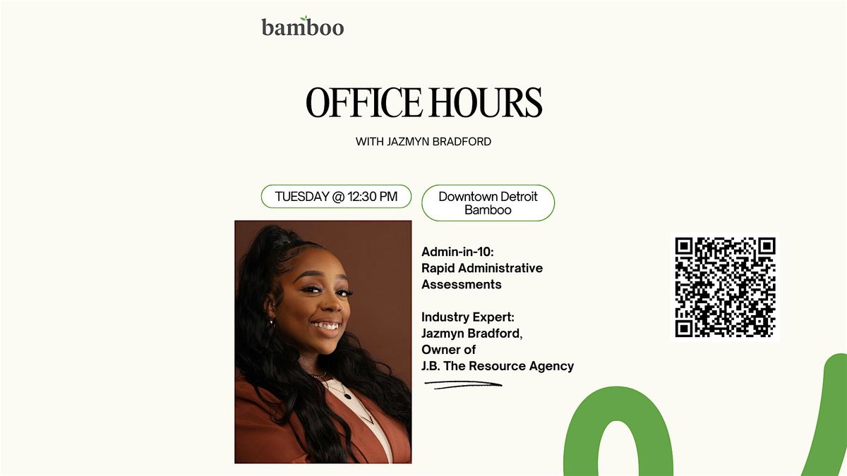 Jazmyn Bradford, owner, will be bringing J.B. The Resource Agency to Bamboo Detroit to support entrepreneurs, nonprofits, and others in strengthening their impact and operations, and will be hosting office hours in our 3rd floor conference room.