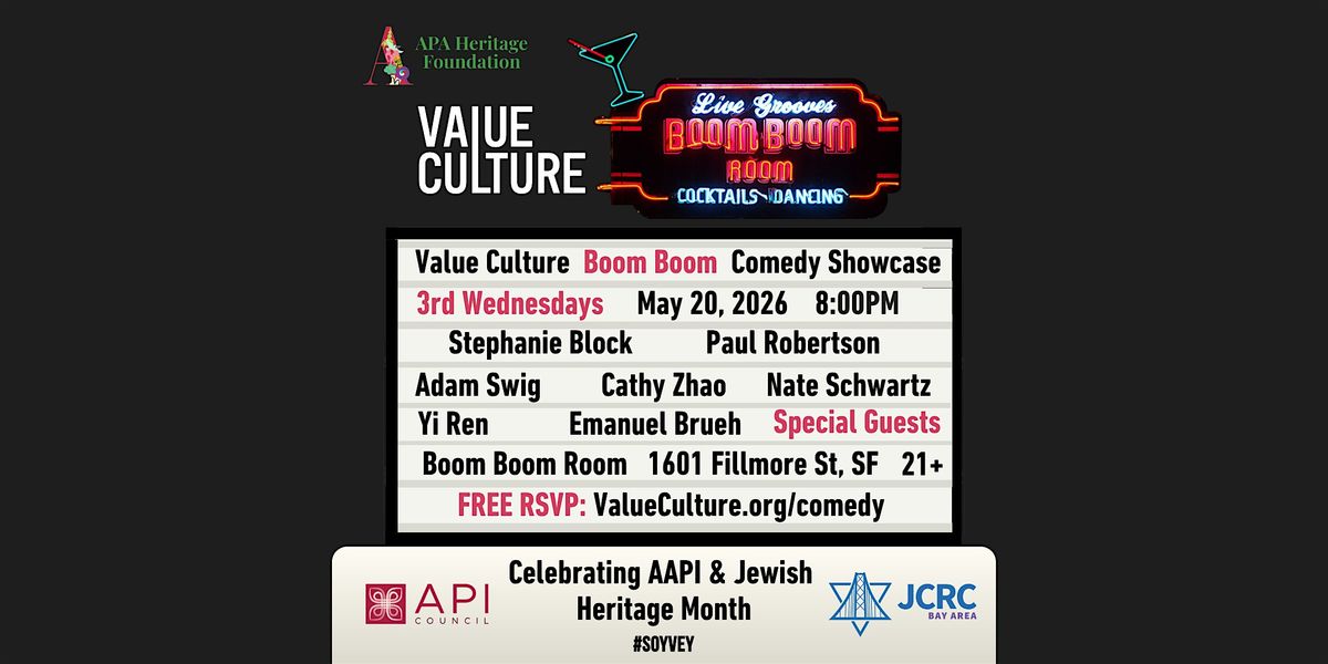 Join us for a special edition of the Value Culture Boom Boom Comedy Showcase, celebrating AAPI & Jewish Heritage Month with a night of laughter, culture, and community in the heart of San Francisco. This special comedy presentation is part of Value Culture's Soy Vey series that bridges Asian and Jewish communties, where soy sauce meets Oi Vey!