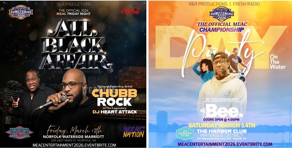 The Official 2026 MEAC Friday Night ALL BLACK AFFAIR Is Back... Celebrating HBCU ALUMNI, Celebrating MEAC, Celebrating The Tidewater Area, Celebrating You! ..This Year We’re Back @ The Norfolk Waterside Marriott 3rd Floor Grand Ballroom And It's Also The Official Battle Of The Decades 80s vs 90s w/ a Sprinkle Of The 2000s Feat. National Recording Artist, CHUBB ROCK & The Legendary DJ HEART ATTACK