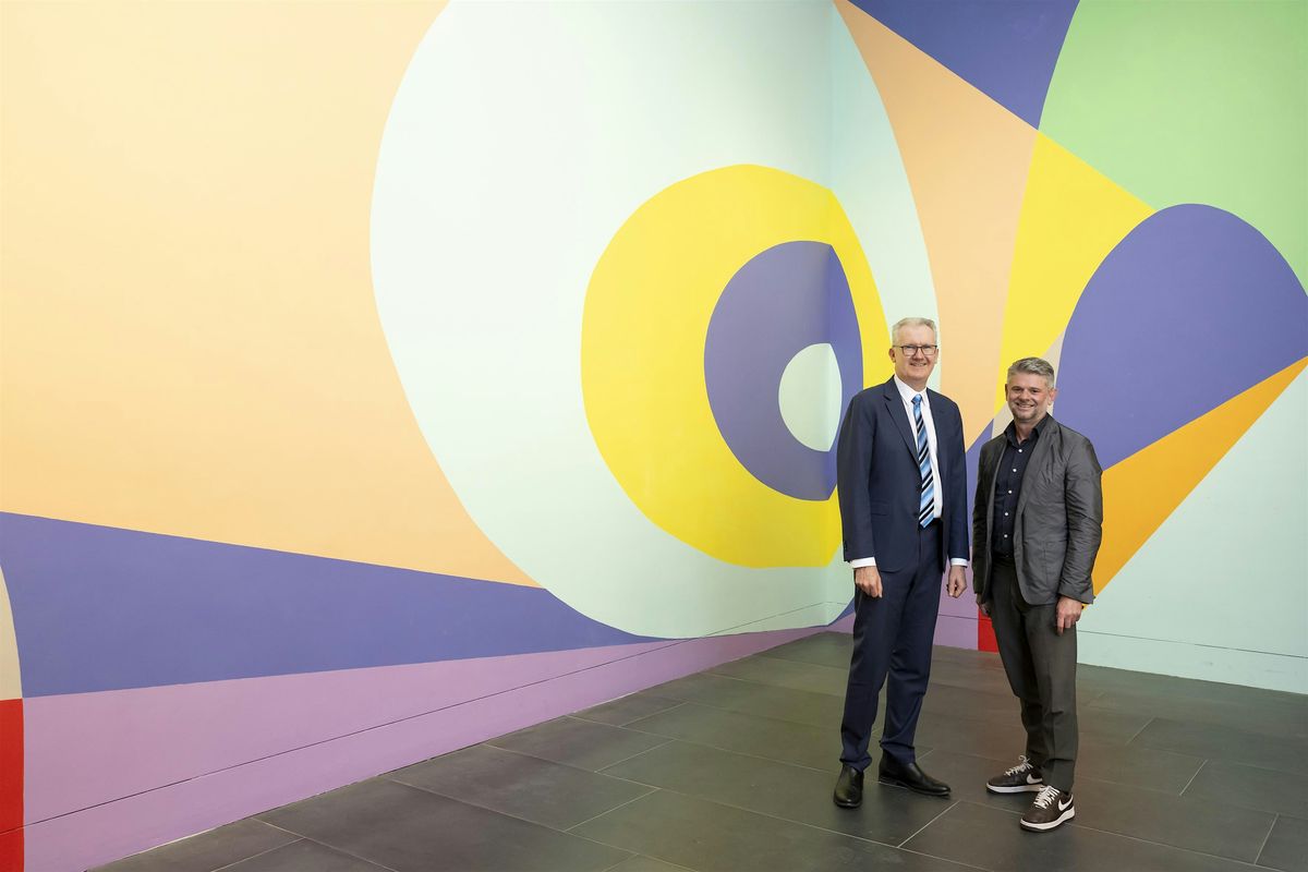 Image credit: Minister for the Arts Tony Burke and Director of the National Gallery, Dr Nick Mitzevich in front of Mikala Dwyer’s, [wall painting], 2020, National Gallery of Australia, Kamberri/Canberra, purchased 2020. © Mikala Dwyer