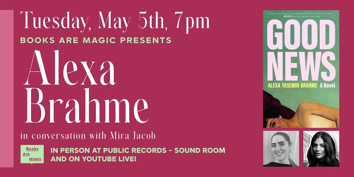 Alexa Yasemin Brahme is a writer from southern California. She received her MFA in fiction from The New School. Her work has been nominated for a Pushcart Prize, the Robert J. Dau PEN Award, and Best of the Net. She currently lives in Brooklyn, where she is a bookseller at Books Are Magic. Good News is her first novel.