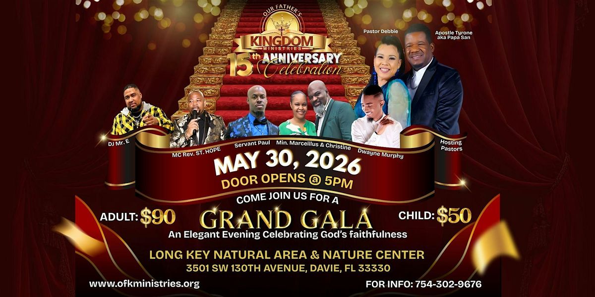 Our Father’s Kingdom Ministries celebrates its 15th Anniversary with a Grand Gala on May 30, 2026, hosted at the Long Key Natural Area & Nature Center in Davie, Florida. Doors open at 5 PM for an elegant evening honoring God’s faithfulness and the ministry’s journey. The celebration features DJ Mr. E, MC Rev. St. Hope, Servant Paul, Min. Marcellus & Christine, and Dwayne Murphy, creating a night of worship, fellowship, and excellence. Tickets are $90 for adults and $50 for children, with the event designed to bring the community together in gratitude and joy. For details or ticket information please call 754‑302‑9676.