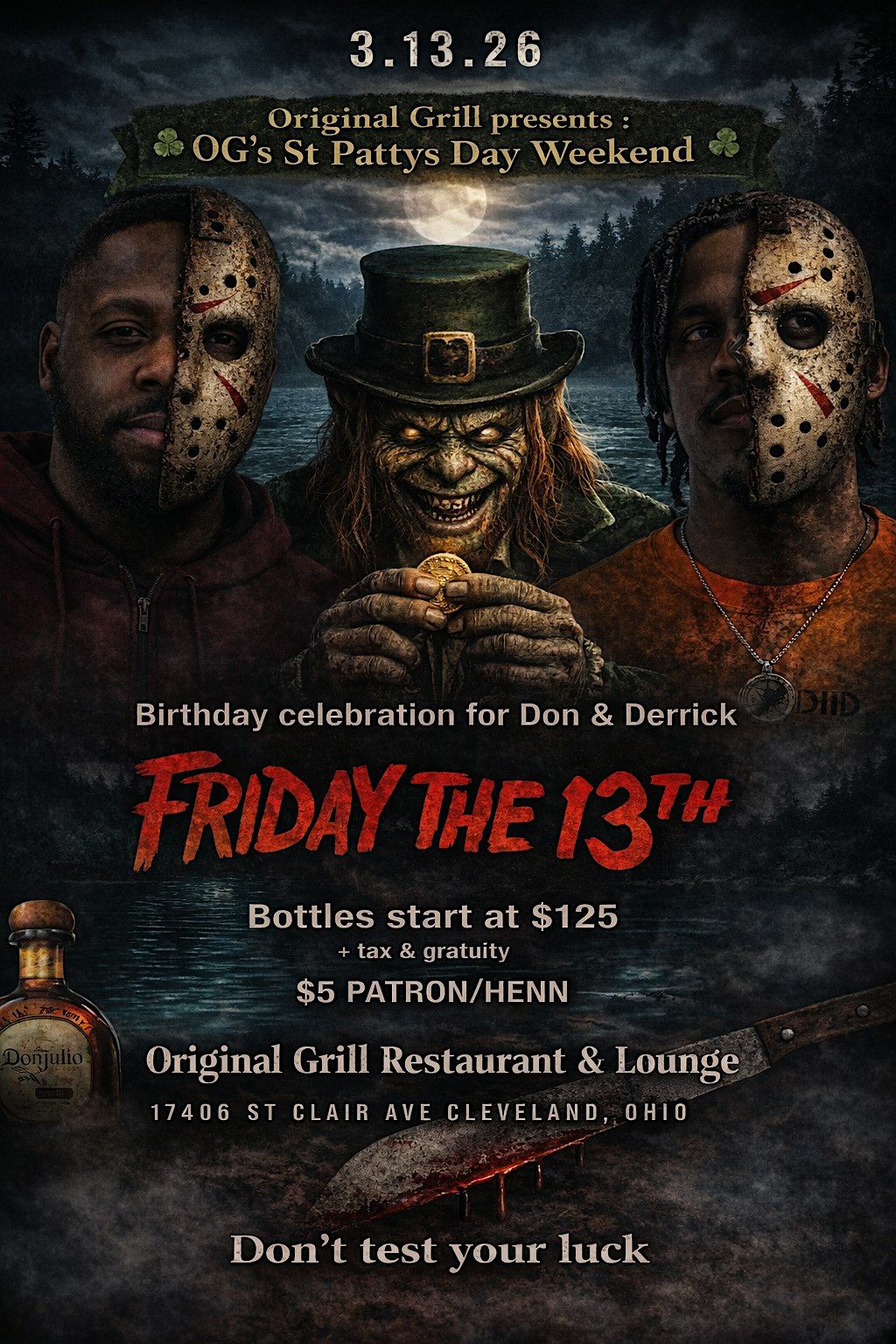 Get ready for an epic Saint Patty's Day weekend kickoff like no other! Join us in person for the OG Friday the 13th celebration — where luck meets a little bit of spooky fun. Bring your crew, rock your greenest gear, and let's make some unforgettable memories. It's gonna be a blast, full of good vibes and great times. Don't miss out!