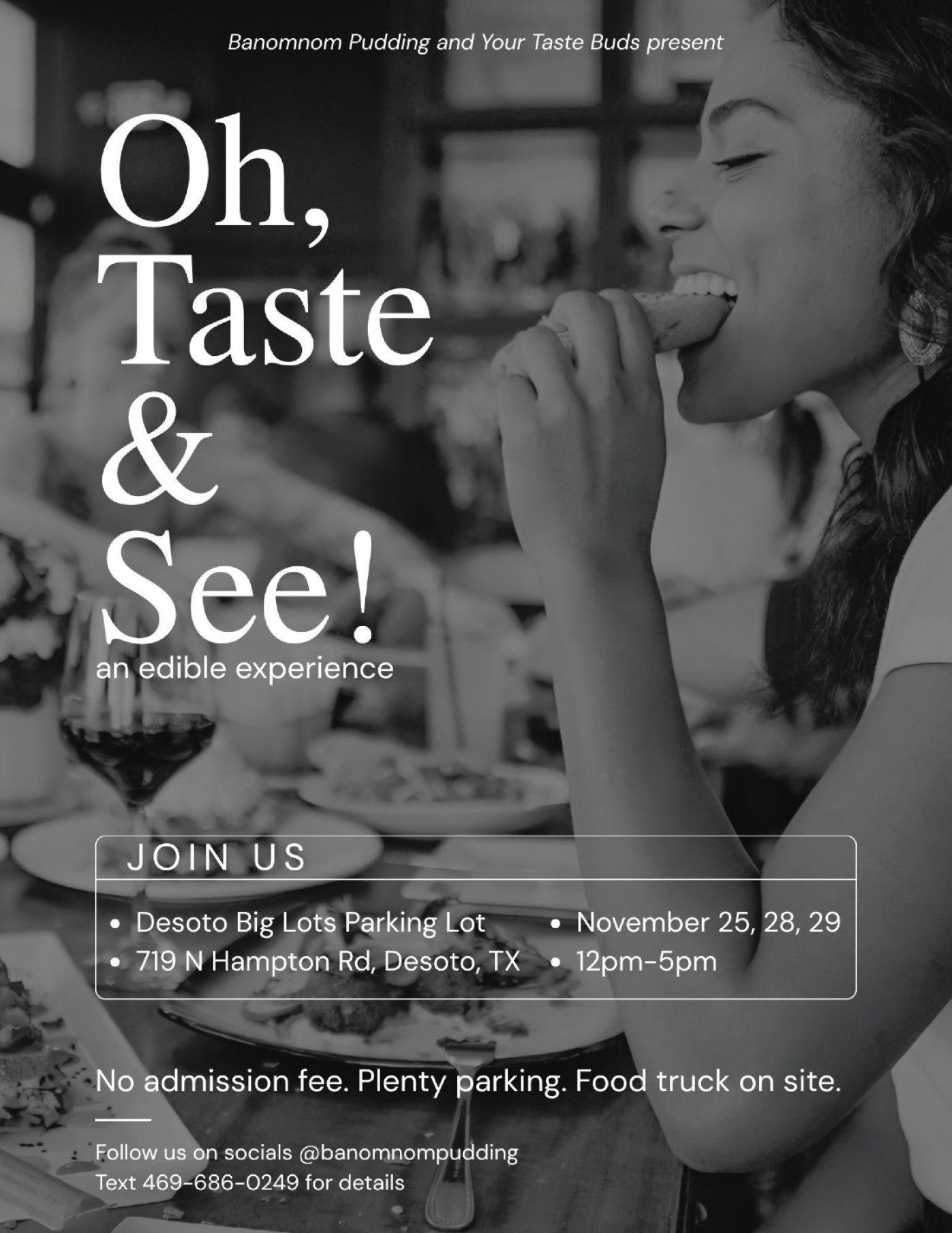 Join us for a new edible experience! Banomnom Pudding is a hidden gem that offers a teaser to your taste buds with an exotic assortment of banana (and no banana) pudding flavors. Meet us in the Desoto Big Lots parking lot located at 719 N Hampton Rd on November 25, 28, and 29 from 12pm-5pm. The experience is best with company, so bring a friend. Oh, taste and see just how great banana pudding can be! See you on the road!