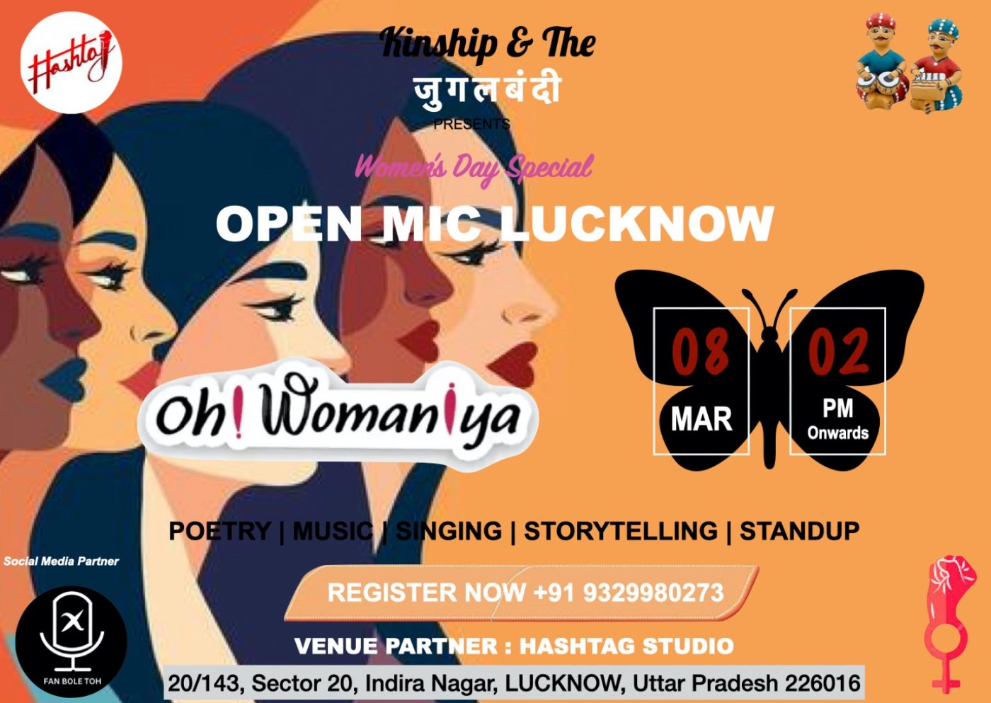 Step into a world of creativity and empowerment at "OH WOMANIYA WOMEN'S DAY SPECIAL- LUCKNOW OPEN MIC " presented by Kinship and the jugalbandi. Join us on March 8, 2026, at Hashtag - Open Mic, Comedy, Poetry & Music Classes in Lucknow for an unforgettable experience.