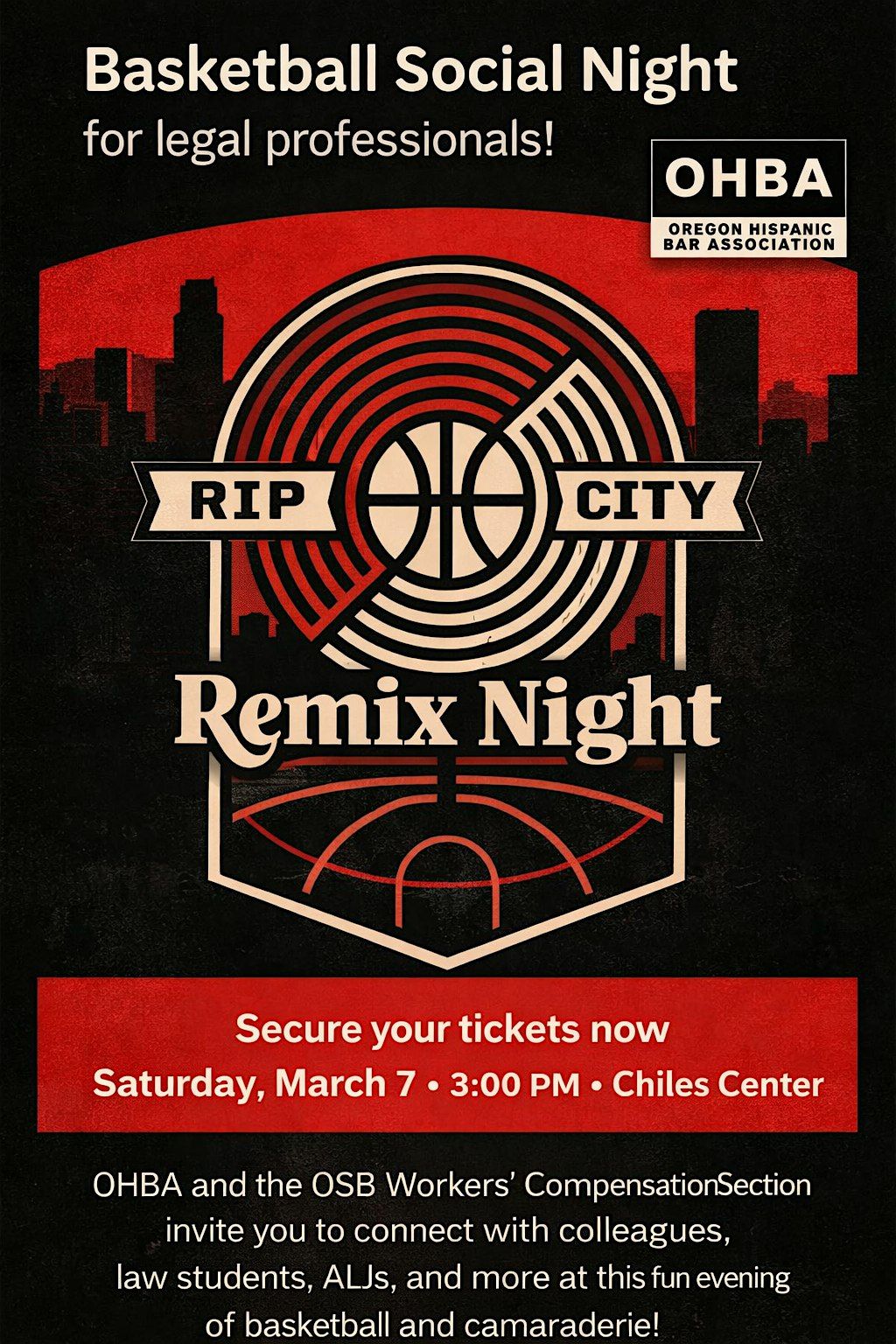 The Oregon Hispanic Bar Association (OHBA) and the OSB Workers’ Compensation Section have teamed up for a fun-filled evening of basketball and camaraderie for our members. A total of 70 tickets are available for OHBA members and OSB Workers’ Compensation Section members, so we encourage you to reserve yours soon.