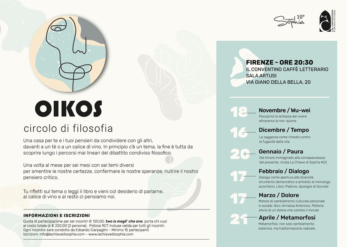 Il progetto OIKOS CIRCOLO DI FILOSOFIA nasce dal concetto greco oikos, casa, da cui ha origine etimologicamente e intorno a cui ruota concettualmente l’economia per gli antichi Greci; ha l’obiettivo di creare momenti di incontro per la comunità, trattando di questioni appartenenti al dibattito pubblico, attraverso la stessa natura della Filosofia: un’interrogazione onesta della realtà e di se stessi.