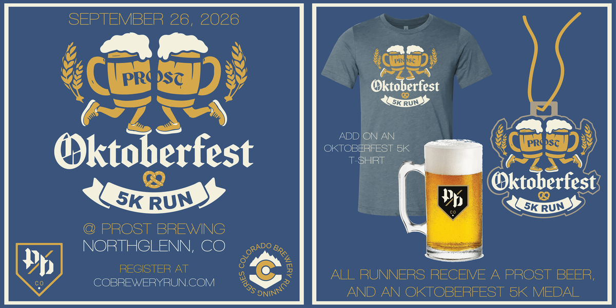Join us for The Oktoberfest 5k at Prost Brewing on September 26, 2026, for a 5k run event that starts and ends at this awesome taproom in Northglenn. Run, walk, jog - whatever goes! Complete the course and celebrate with us and a FREE Prost beer or NA beverage at the finish line.