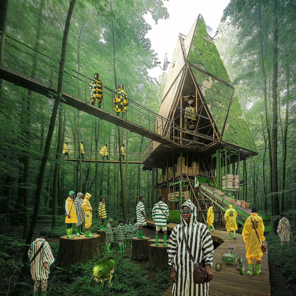 Olalekan Jeyifous (b. 1977) received a BArch from Cornell University and is a Brooklyn-based artist whose work reimagines the intersections of architecture, community, and the environment through inventive visual storytelling. By merging physical and digital elements with historical and speculative contexts, his practice offers critical reflections on existing systems while imagining alternative ways of relating to one another and the spaces we inhabit. His art has been exhibited at major institutions including the Studio Museum in Harlem, the Vitra Design Museum, and Guggenheim Bilbao, and is held in the permanent collections of the Museum of Modern Art, the Art Institute of Chicago, and SFMOMA.