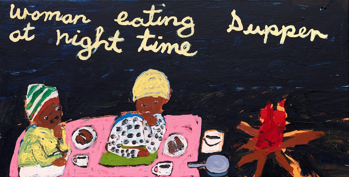 Image: Sally M Nangala Mulda, Women Eating Supper at Night Time 2018, synthetic polymer paint on linen, 46 x 90 cm, Art Gallery of New South Wales