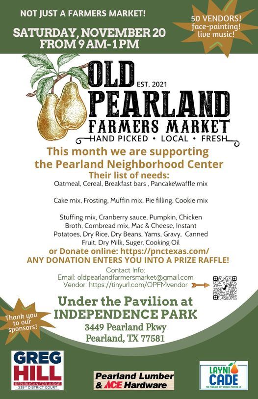 50 VENDORS SCHEDULED FOR SATURDAY 11/20! PLUS LIVE MUSIC! Join us for ?Pearland’s newest farmers market every 3rd Saturday in the heart of Pearland, at Independence Park! This month we are highlighting ?Pearland Neighborhood Center which provides a variety of services to local families in need. So bring donations from the list they provided (in the comments) or your ?cash donations to be entered for chance to win a great raffle prize from local businesses. Donations are accepted at the welcome table at the entrance of the market.