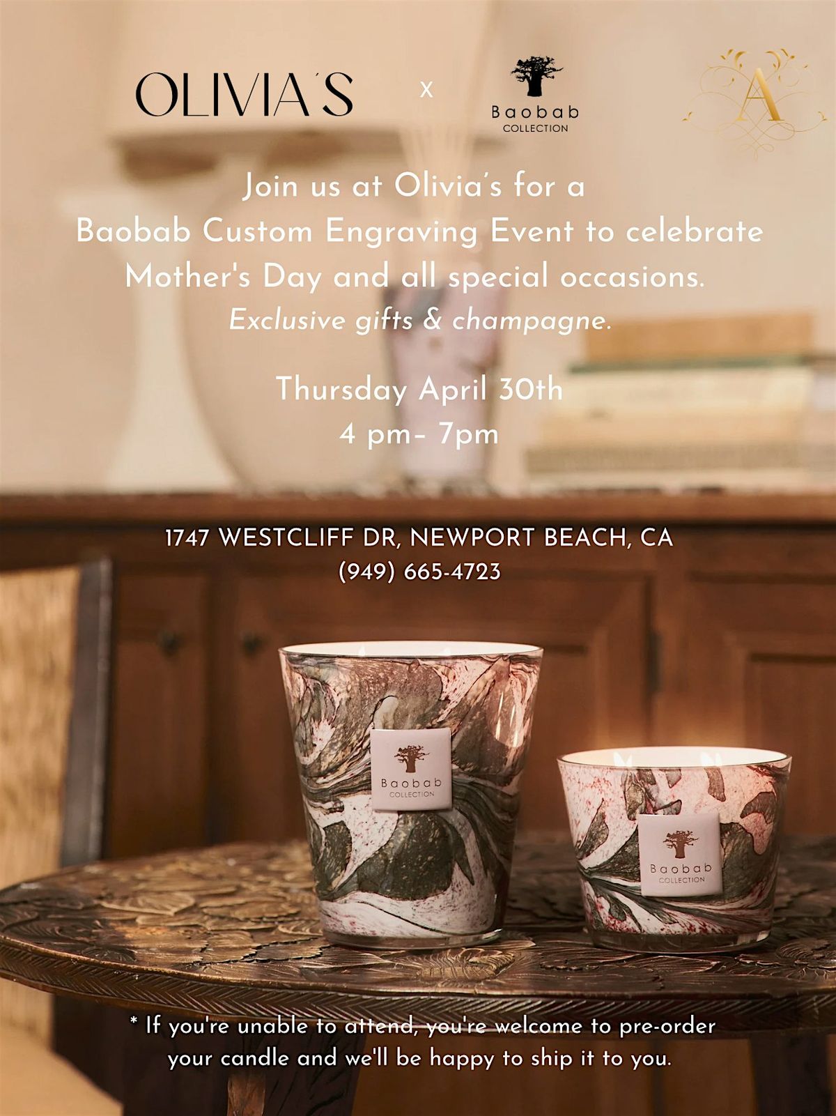 Join us in person for Olivia's Mother's Day Baobab Custom Engraving Event! It's the perfect chance to create a unique, heartfelt gift. Customize your Baobab candle with a special engraving that shows your love and appreciation. Bring your mom, friends, or come solo for a fun and creative experience. Don't miss out on making this Mother's Day truly memorable with a one-of-a-kind keepsake!