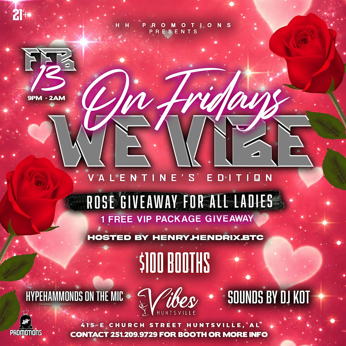 Welcome to On Fridays We Vibe: Valentines Day Edition happening at 415 Church St NW on February 13, 2026 at 8:30 PM. Let's celebrate Valentine's Day by give every lady a rose. Don't miss out on this special evening! Mark your calendars and spread the love. See you there!