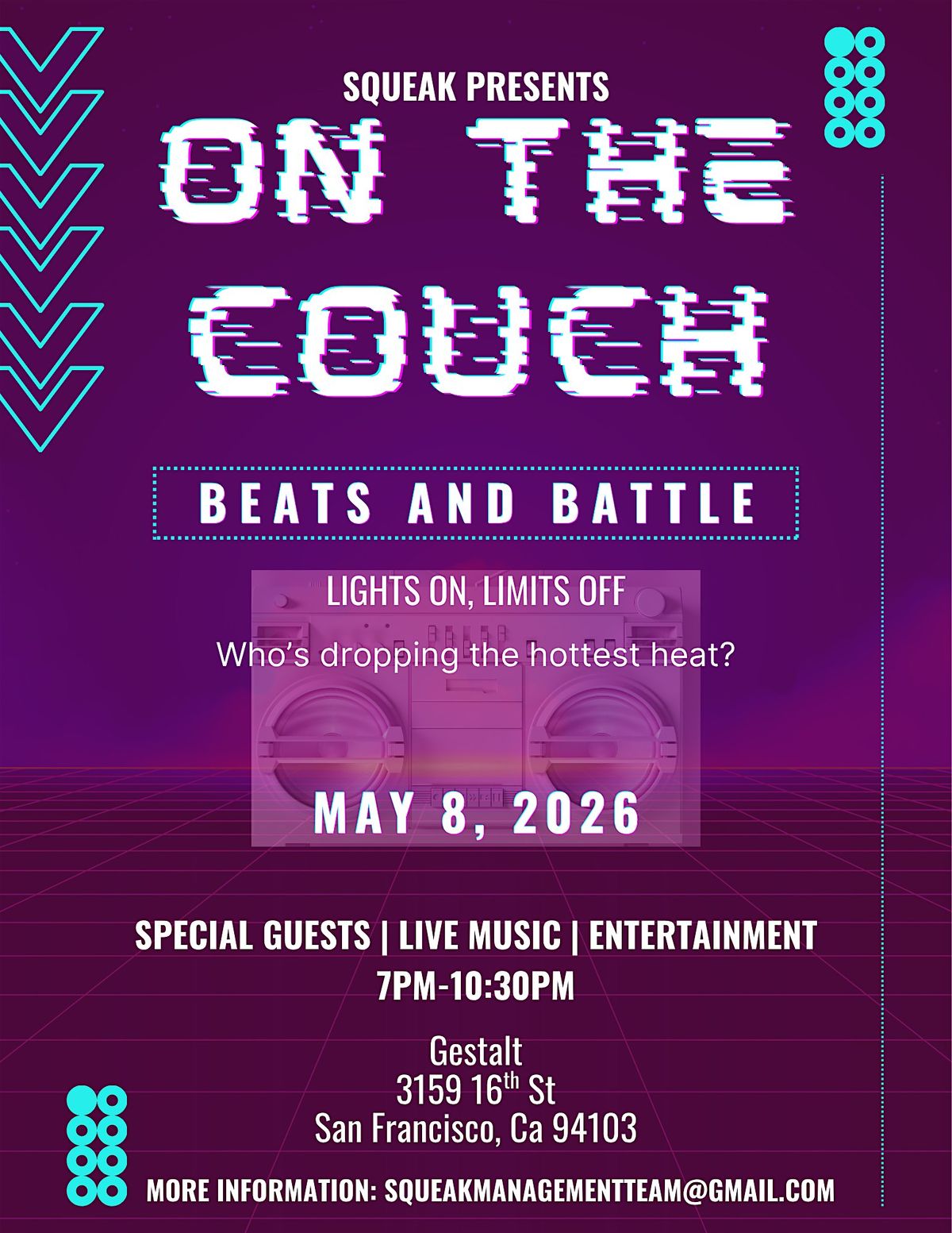 Get ready for an epic night on the couch with killer beats and fierce battle music! This in-person event brings together the best artists dropping fresh tracks and battling it out live. Whether you're here to vibe or witness some serious musical throwdowns, this showcase promises non-stop energy and unforgettable moments. Don’t miss out on the ultimate music showdown! It's like hanging out on the couch with your favorite