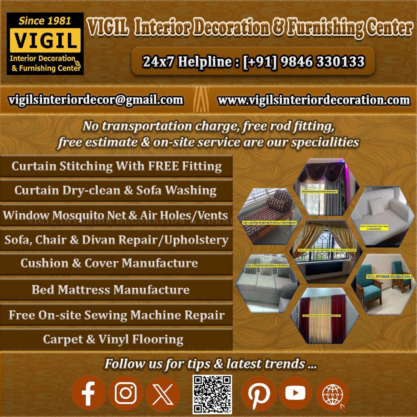 VIGIL Interior Decoration and Furnishing Center, Vrindavan Gardens, Pottakkuzhi, Pattom Junction Near P.F Office and Pattom Palace Post Office, Petrol Pump, opposite Pattom, Vrindavan Gardens, Thiruvananthapuram, Kerala 695004, India