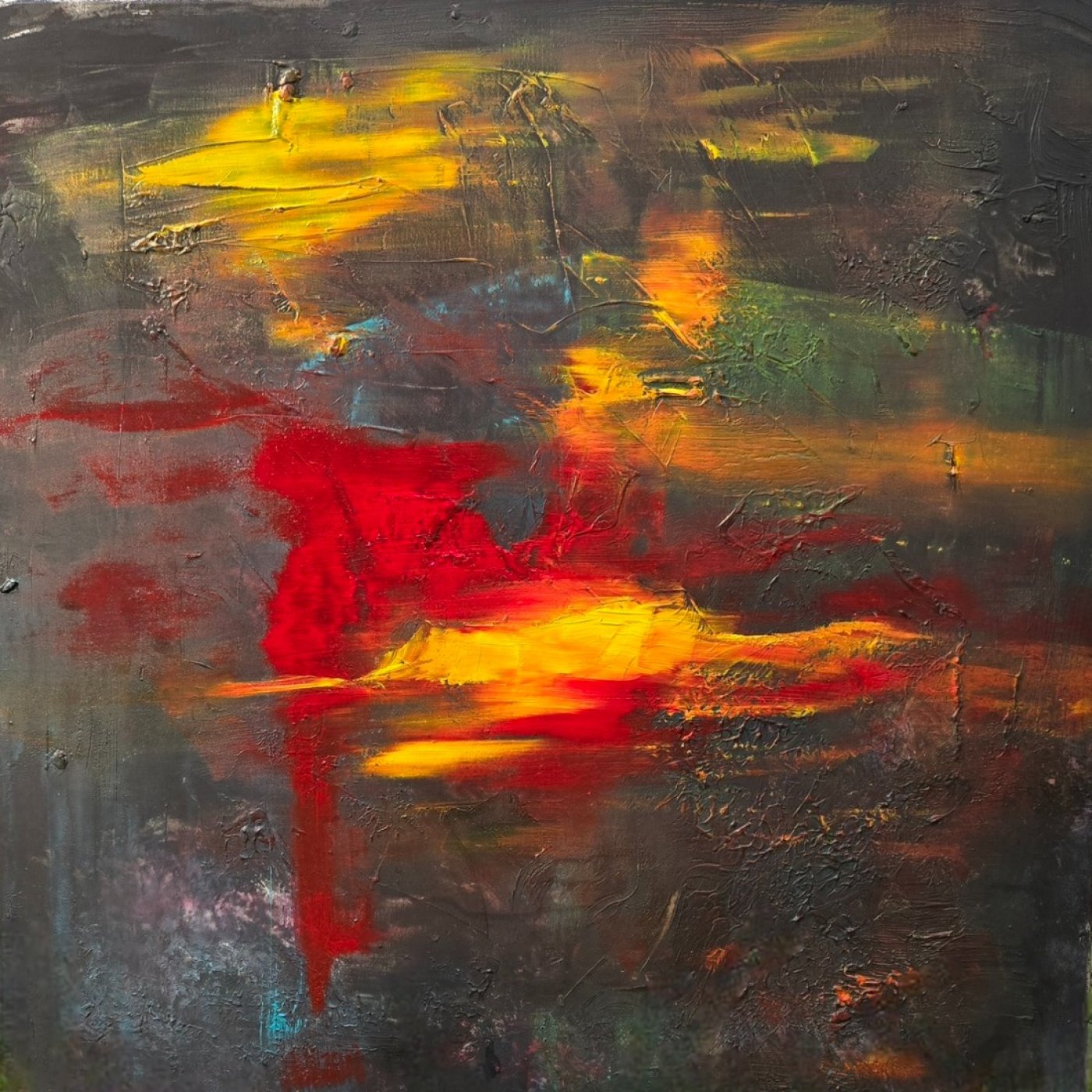 Using acrylics and mixed media, McIntosh allows intuition to guide the process. Paint is added, disrupted, and reshaped, revealing tension, erosion, and renewal. Control and release exist together, mirroring the way growth follows damage.