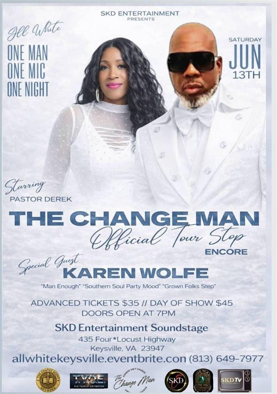 All White Summer Tour. One Man One Mic One Night. Pastor Derek The Change Man Smith / Karen Wolfe. $35 advance, $45 door. Grown folks only.
