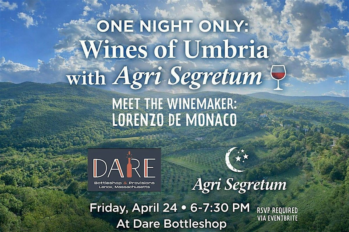 Join us at Dare Bottleshop for a special evening with Lorenzo de Monaco, winemaker and steward of Agri Segretum, a small family estate in the heart of Umbria, Italy.