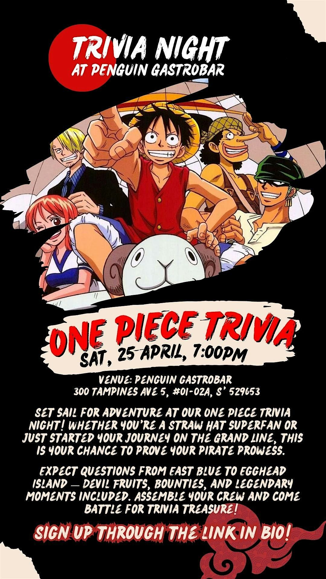 Come early or stay throughout the night — the venue serves food and drinks, so you can enjoy dinner and drinks while playing. There will also be prizes for the top teams, so bring your best nakama and get ready for a fun night of trivia! ⚓🍻