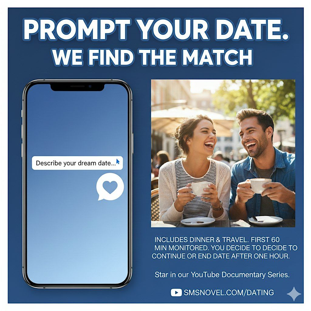 Tired of the endless cycle of swiping and small talk? SMS Novel Films introduces One Prompt Date™—the world’s first on-demand, concierge-style dating experience. We remove the guesswork, the awkward planning, and the safety concerns of modern dating by turning your specific preferences into a real-world connection in just hours.