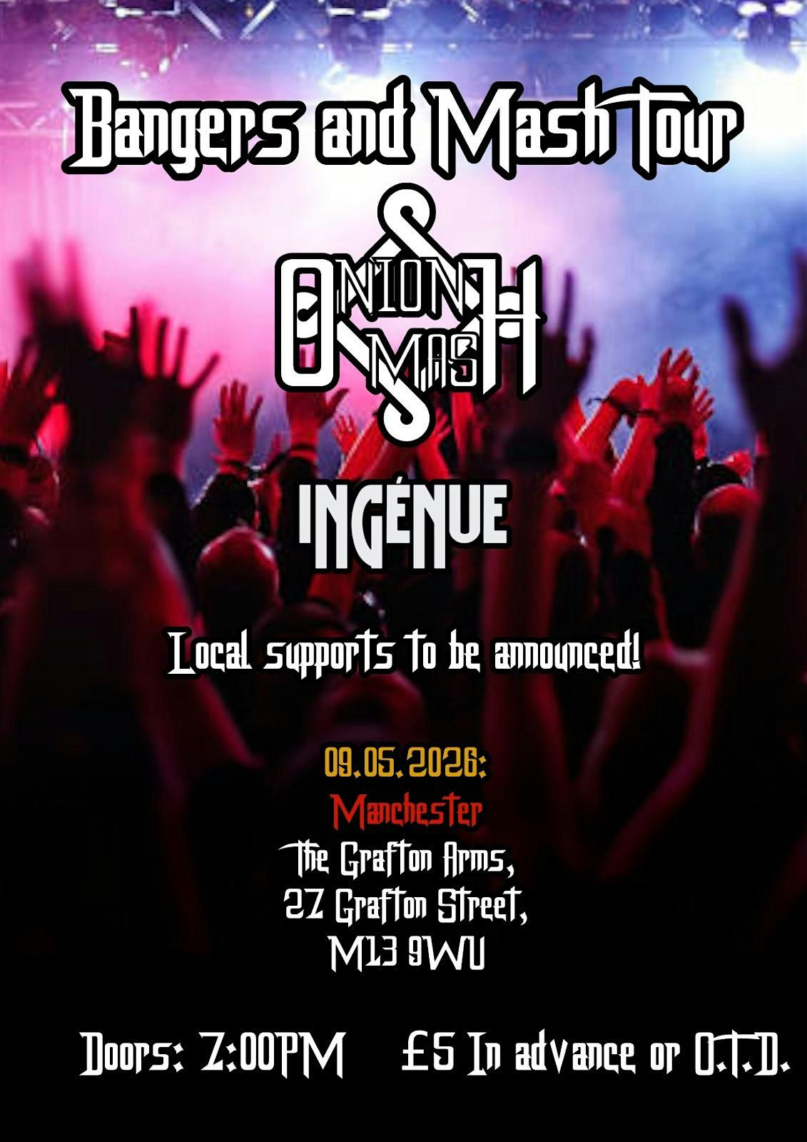 Onion Mash are bringing their ‘Bangers and Mash’ tour to Manchester! Prepare for an amazing night full of electric performances and heavy riffs from both Onion Mash and Ingenue. Local supports to be announced!