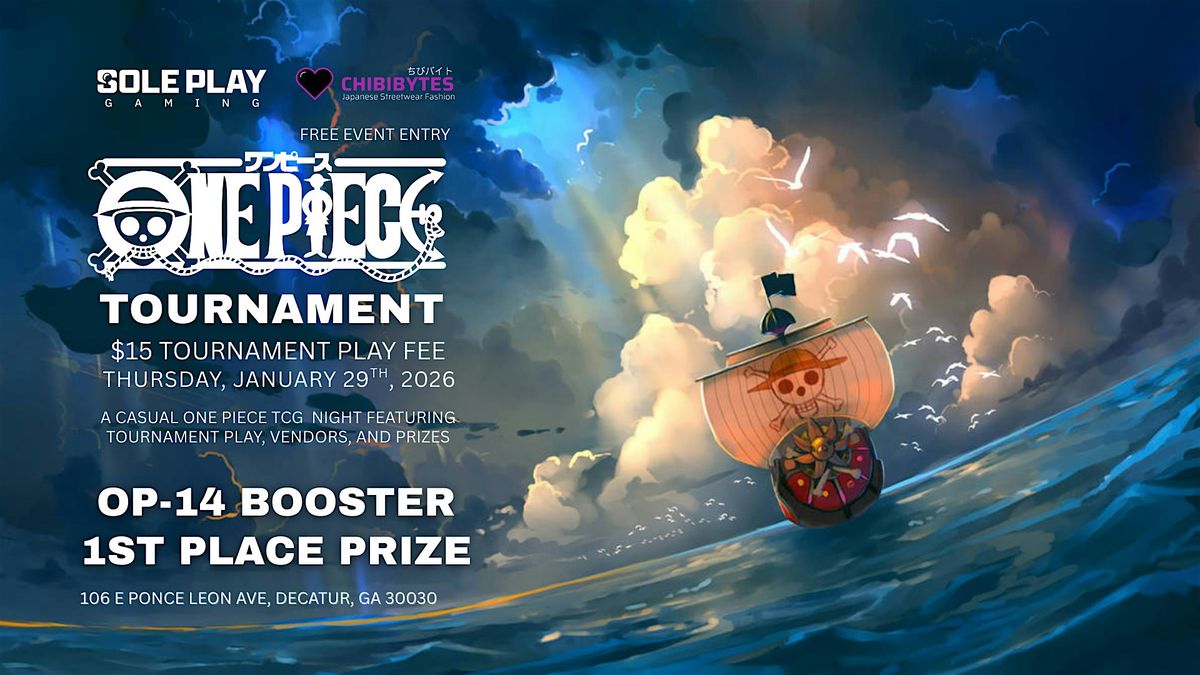 Welcome to the OP14 One Piece Tournament in Decatur hosted by Chibibytes + Soleplay Gaming! Get ready for an epic showdown at Soleplay Gaming on January 29, 2026 at 6:00 PM (Eastern Time). Join us for a day filled with intense battles, unforgettable moments, and tons of fun! Whether you're a seasoned pro or just starting out, this event is perfect for all One Piece fans. Don't miss out on the chance to showcase your skills and make new friends in the community. Mark your calendars and get ready to embark on an adventure like no other!