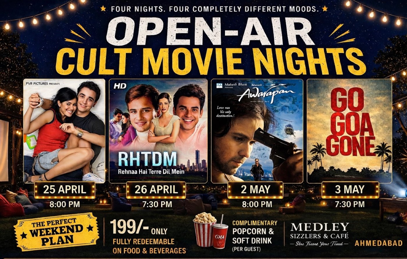 Step into a nostalgia-packed journey under the starlit sky and embrace the magic of cinema at the 'Open-Air Cult Movies Night' presented by Medley Sizzlers & Cafe. Get ready to relive the golden era of Bollywood for 90’s kids.