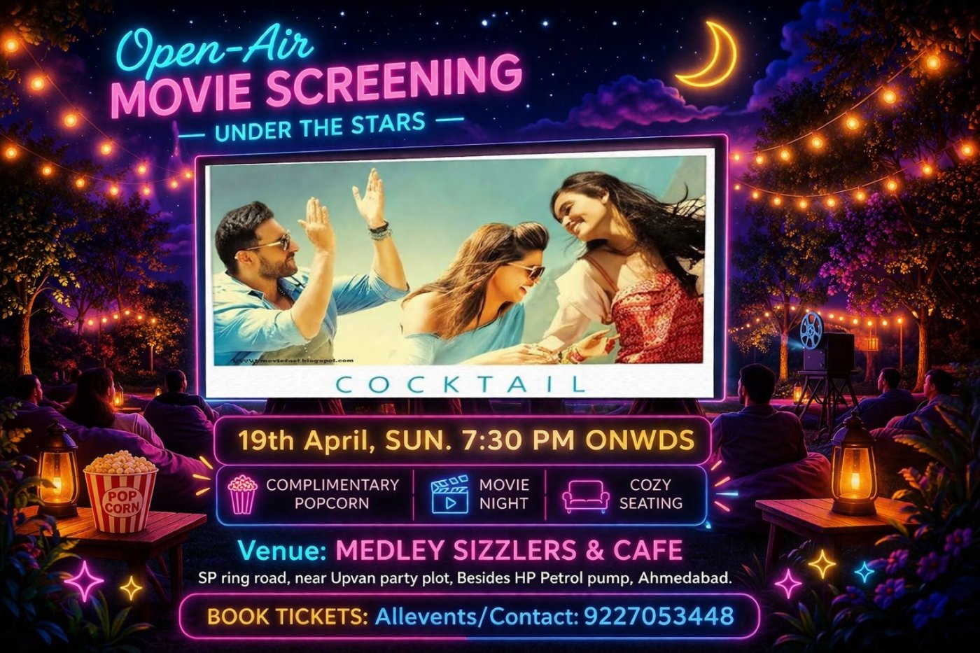 π Featuring a special big-screen showcase of the iconic album of COCKTAIL, this event promises a whimsical journey through laughter, love, and life. Secure your spot for just βΉ199 per person with seating on a first-come, first-served basis.